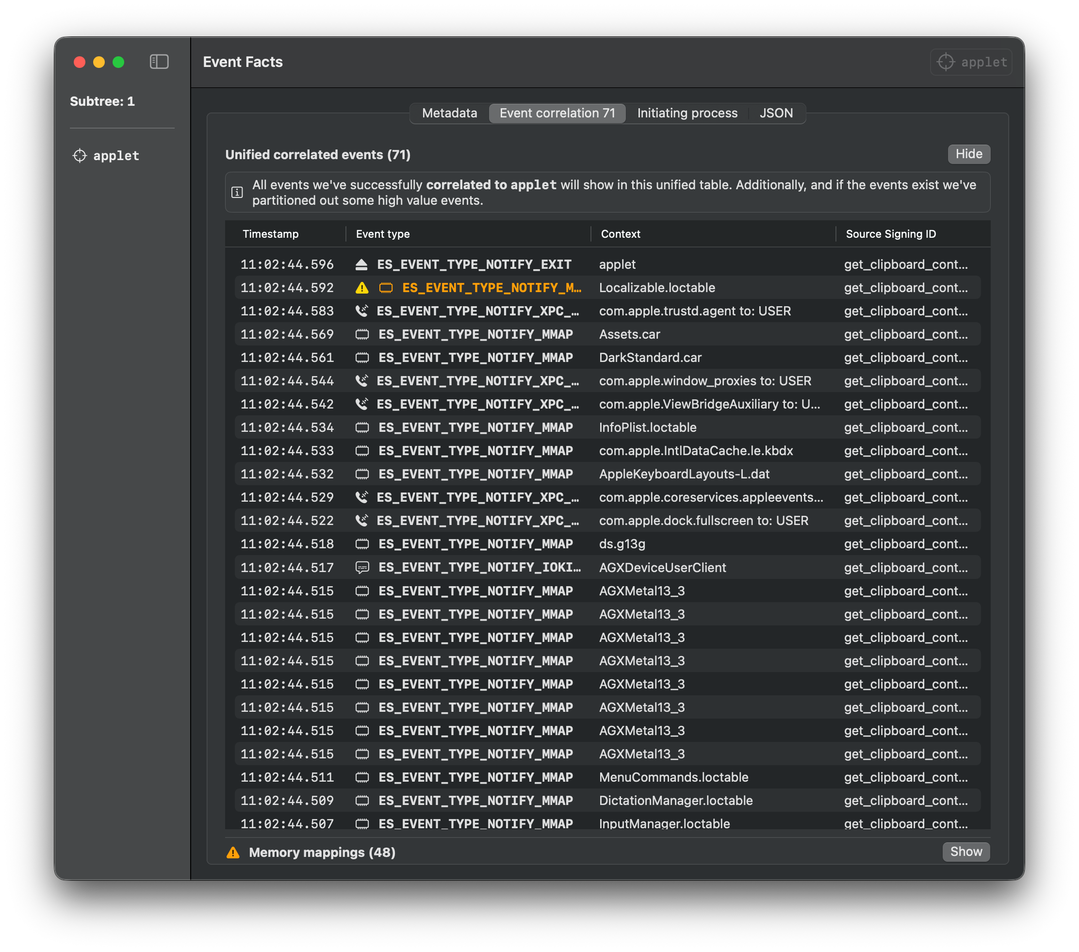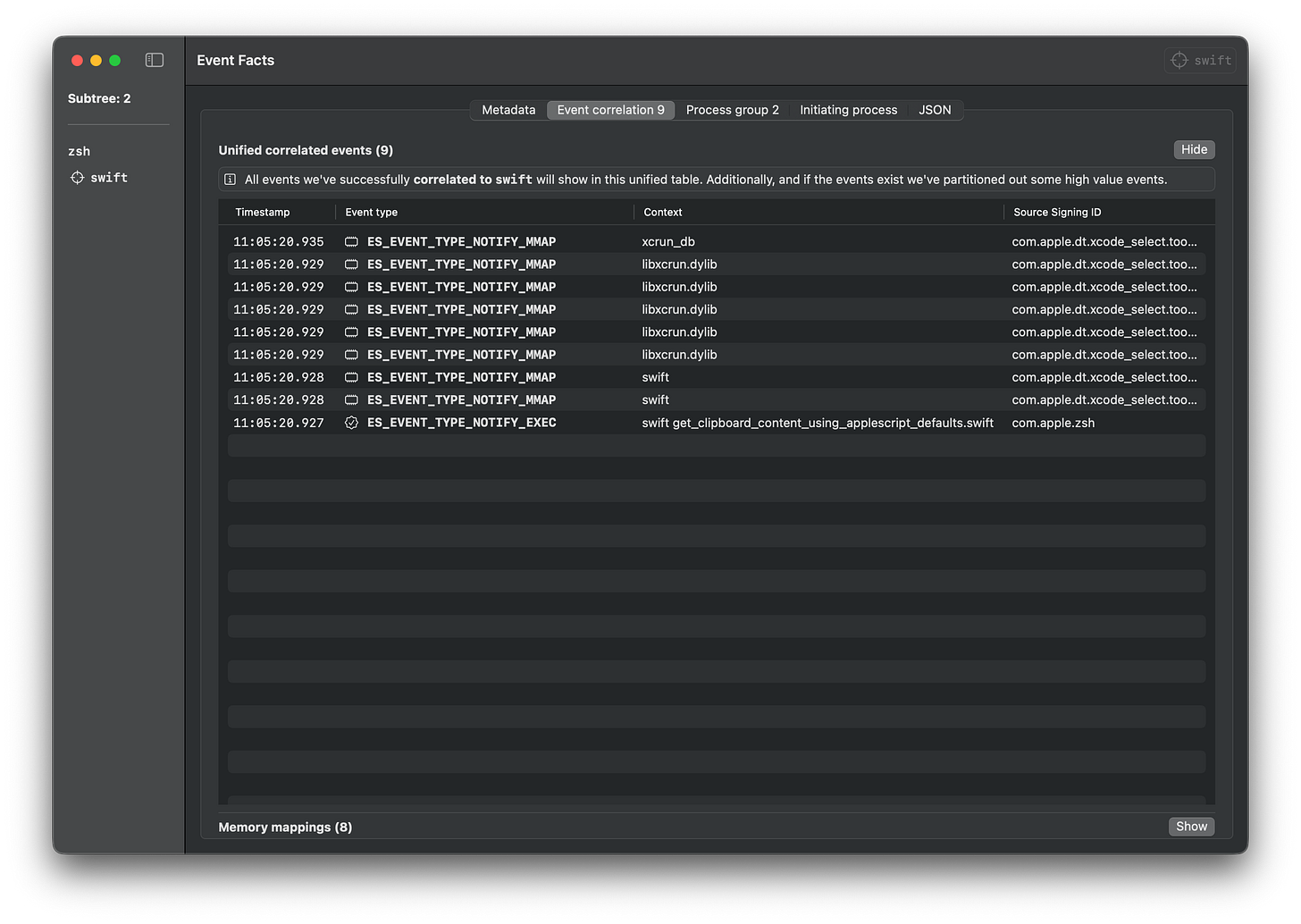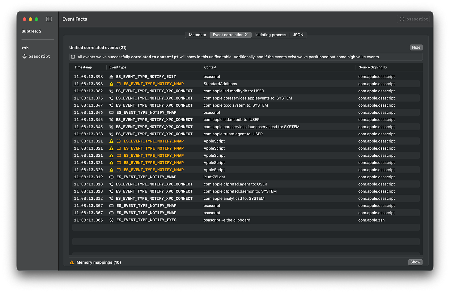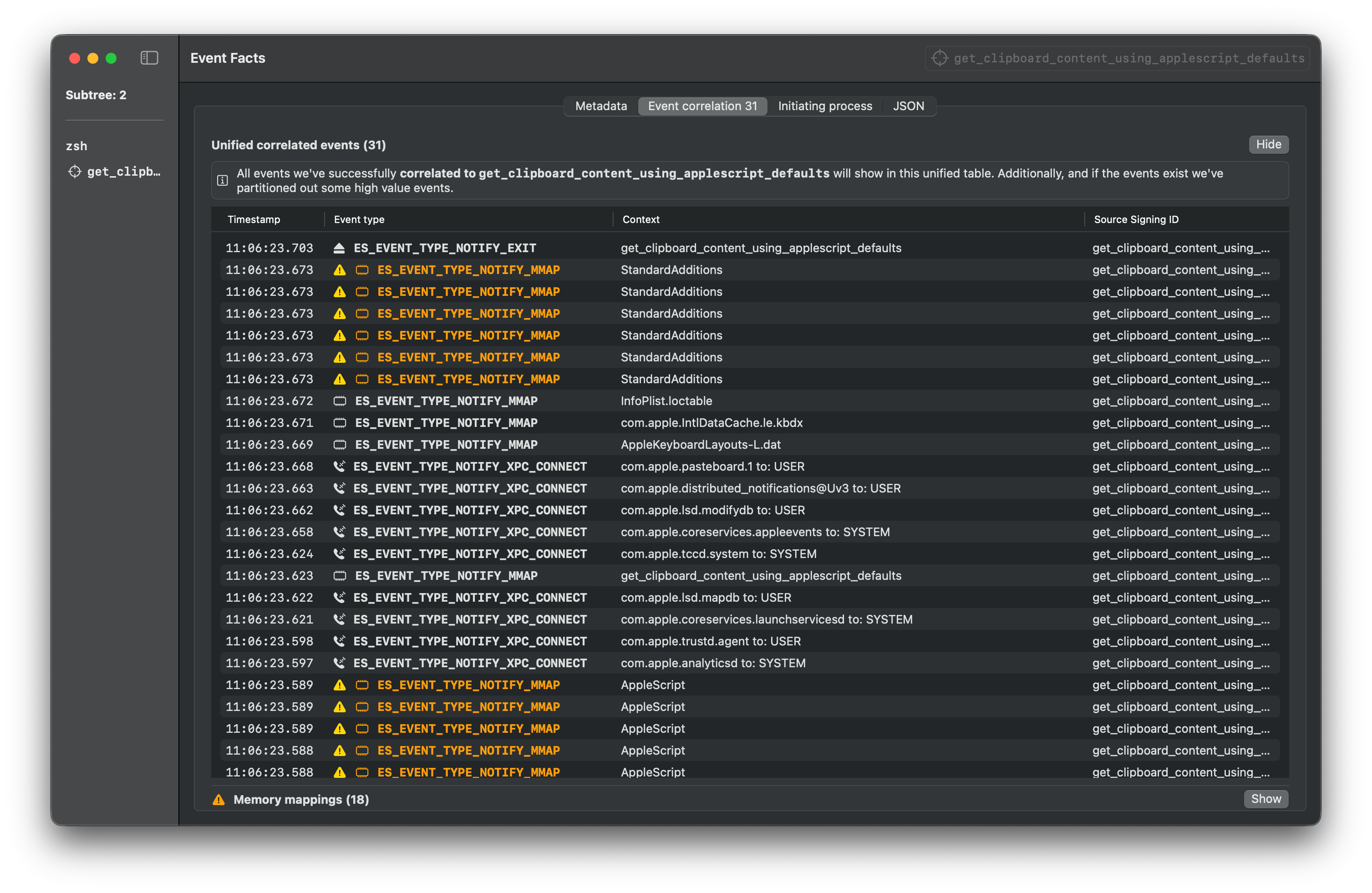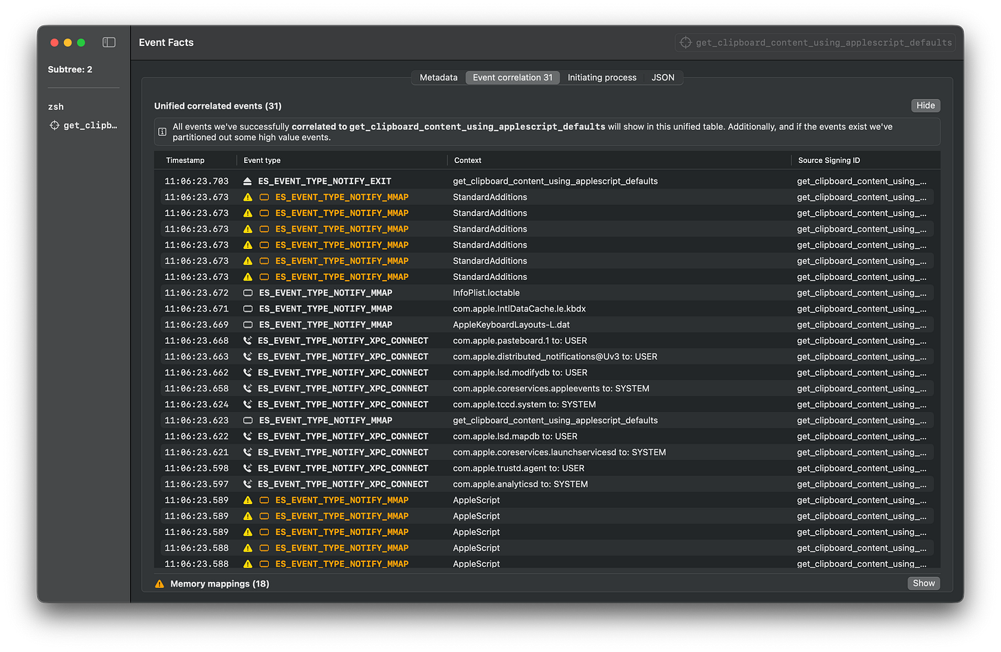 The sample Endpoint Security logs below were gathered using Mac Monitor for each execution method when retrieving clipboard content.