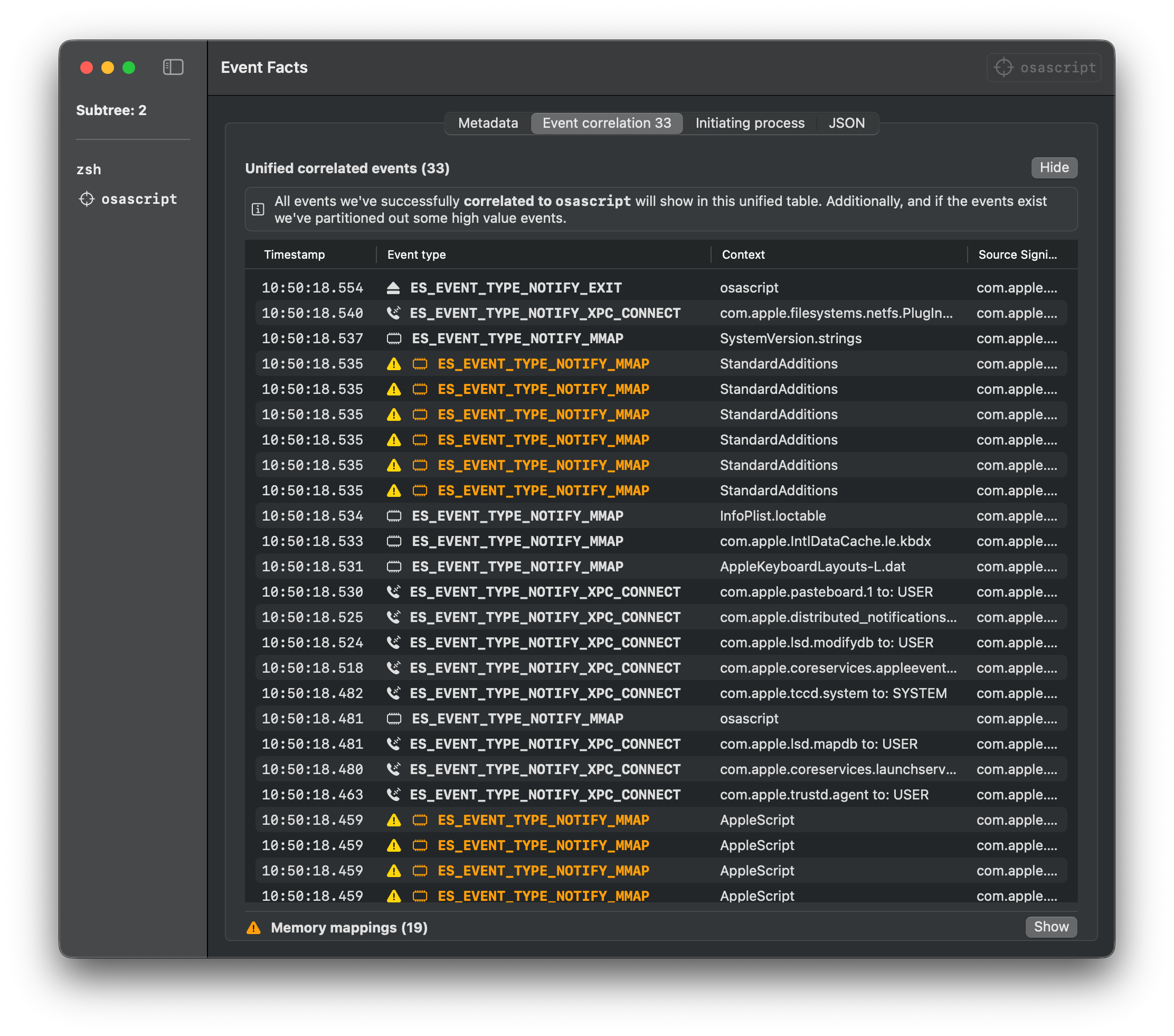 Understanding how AppleScript techniques appear in your security logs is critical for detection engineering. LOAS tests can be executed using five different methods, each creating distinct forensic artifacts and detection opportunities: